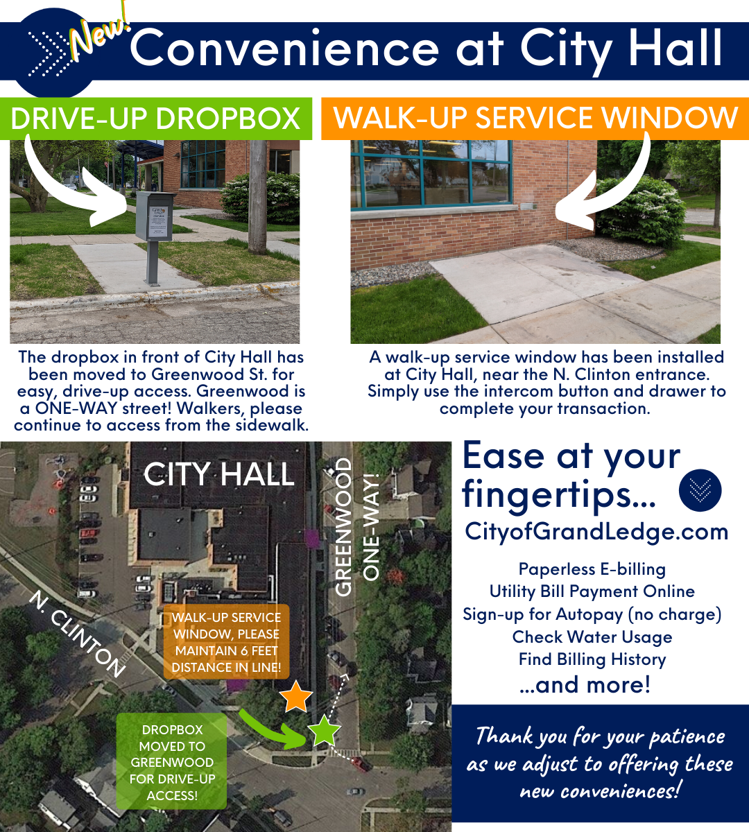 - We encourage residents and businesses to utilize mail, drive-up drop-box, and walk-up window at City Hall for payments, permits, applications, and any other correspondence. Residents and businesses are encouraged to utilize online options through our website.