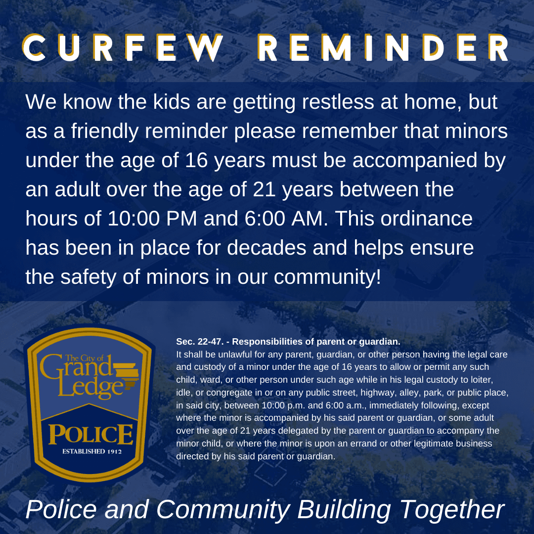 - Curfew Reminder (JPG): Minors under the age of 16 years old must be accompanied by an adult over 21 years between the hours of 10 pm to 6 am.
