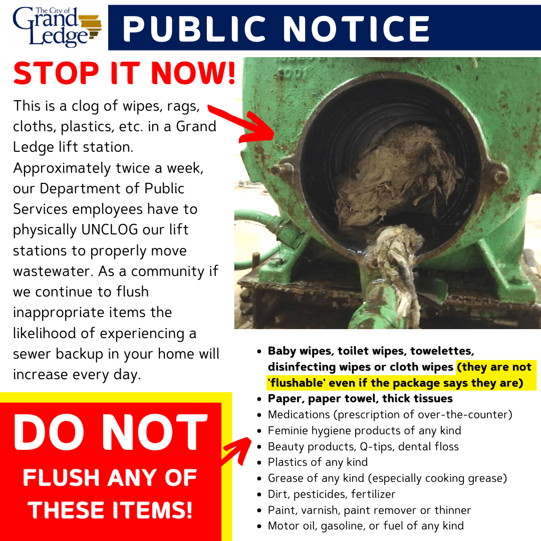 - Residents should only flush toilet paper. No other items should be flushed at any time. View the "No Wipes in Pipes" Notice (PNG).