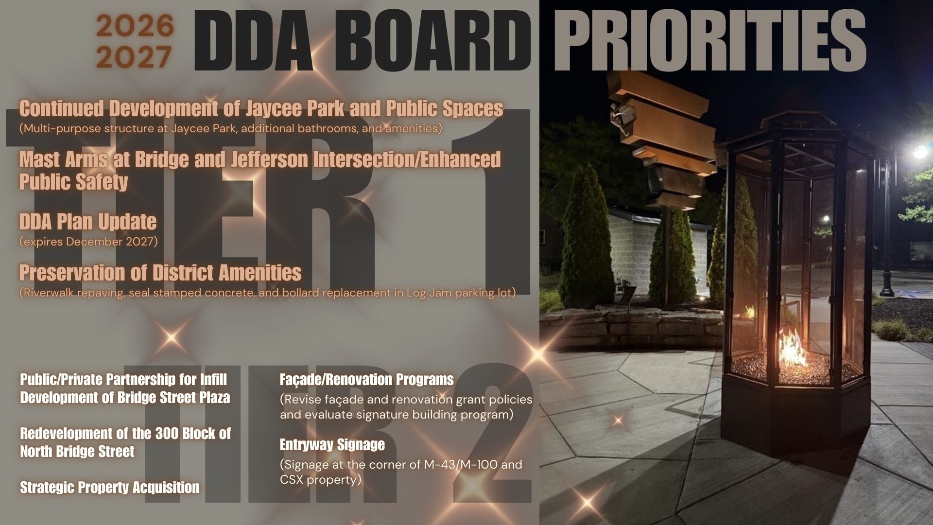The Downtown Development Authority (DDA) promotes economic growth and revitalization within the City's business districts along Bridge Street, Clinton Street, and Saginaw Highway.