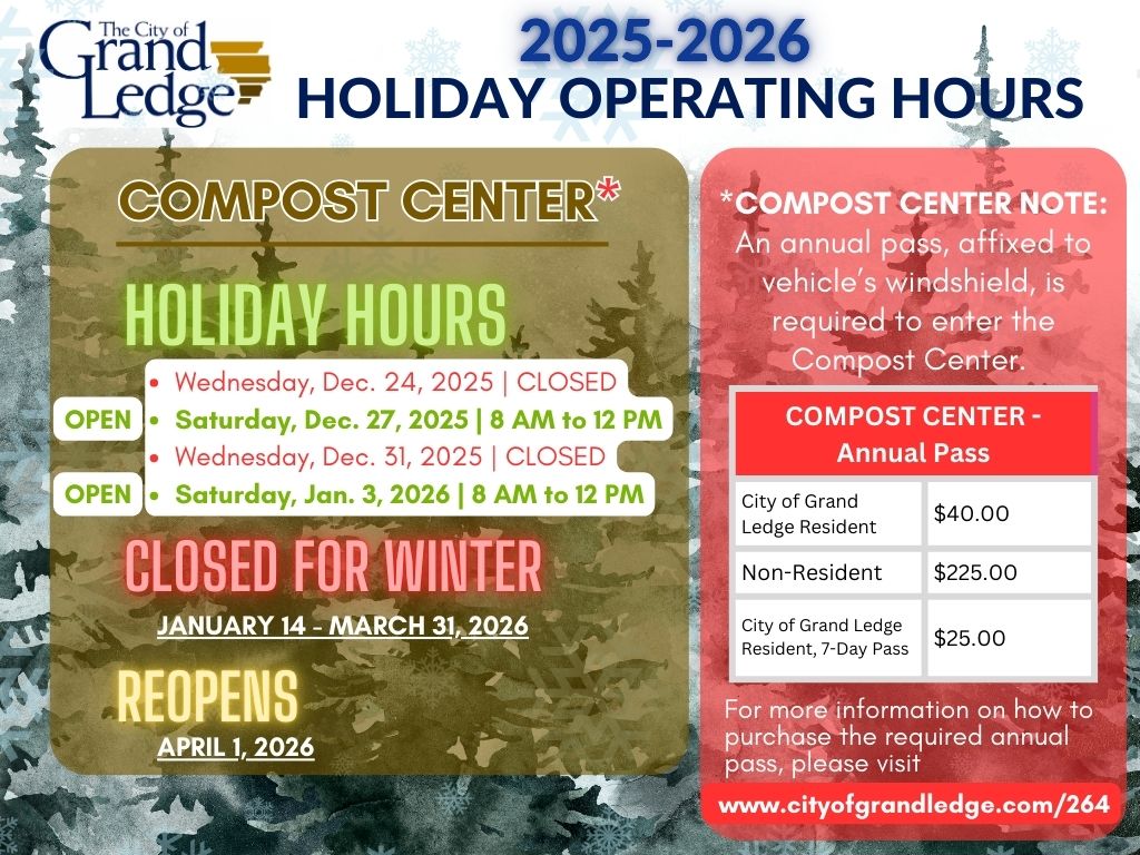 Please take note of the holiday operating hours at the Compost and Recycling Centers. In addition, for 2026, the Recycling Center is only available to City of Grand Ledge residents who have a 2026 Recycling Center sticker affixed to the windshield of their vehicle. The Compost Center will continue to be open to City of Grand Ledge residents and non-residents with the required Compost Center sticker affixed to the windshield of their vehicle.