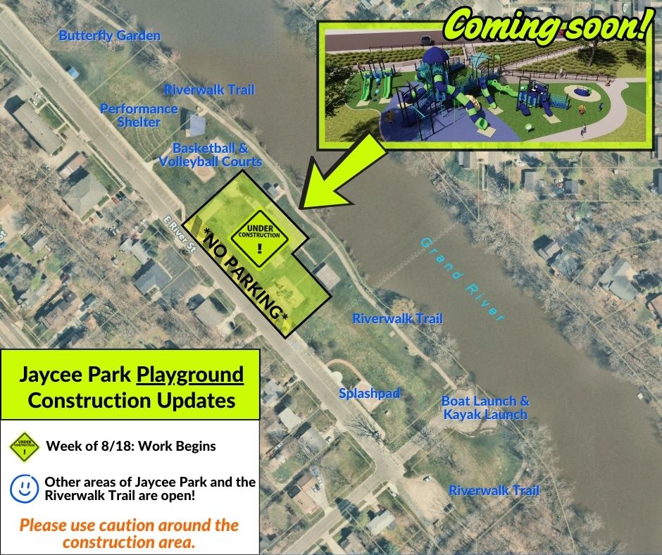 This week, construction has started at Jaycee Park to bring the new ADA Inclusive Playground to reality! While Jaycee Park remains open, please use caution around the construction area and refrain from parking in any areas that are blocked off.